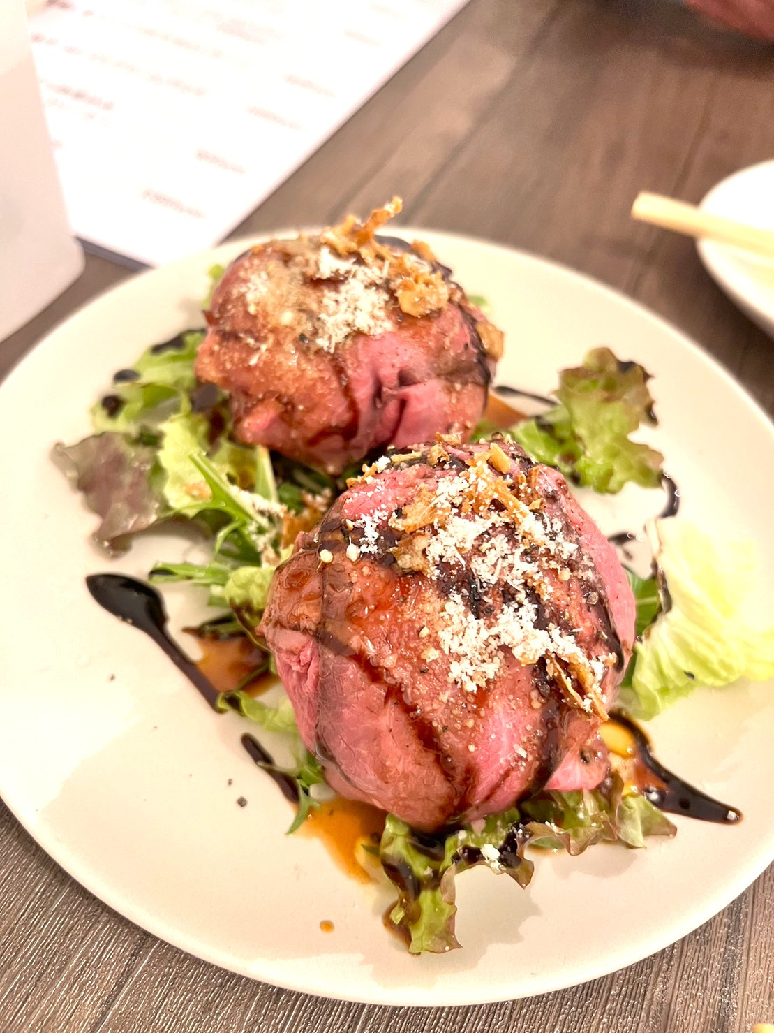 〆にローストビーフで肉巻きおにぎりを注文!